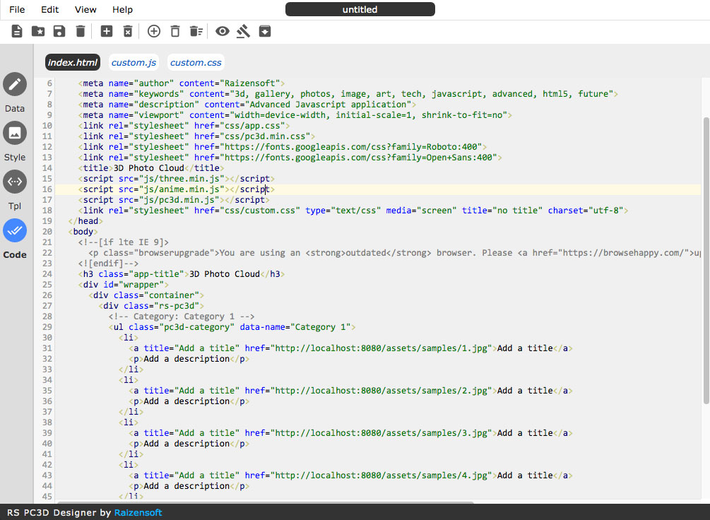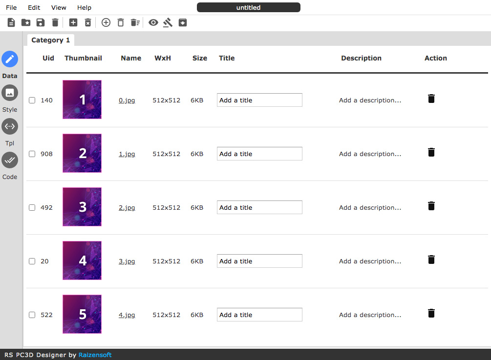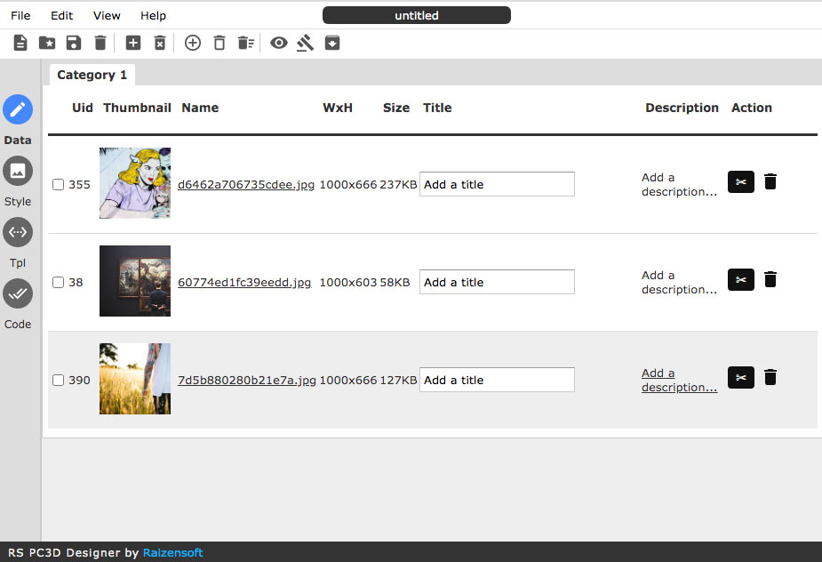 The Data Editor view is where you can manage gallery data items including uploading, deleting, modifying the item and its metadata. You can also change the item title, descripiton and crop the image in Data Editor.