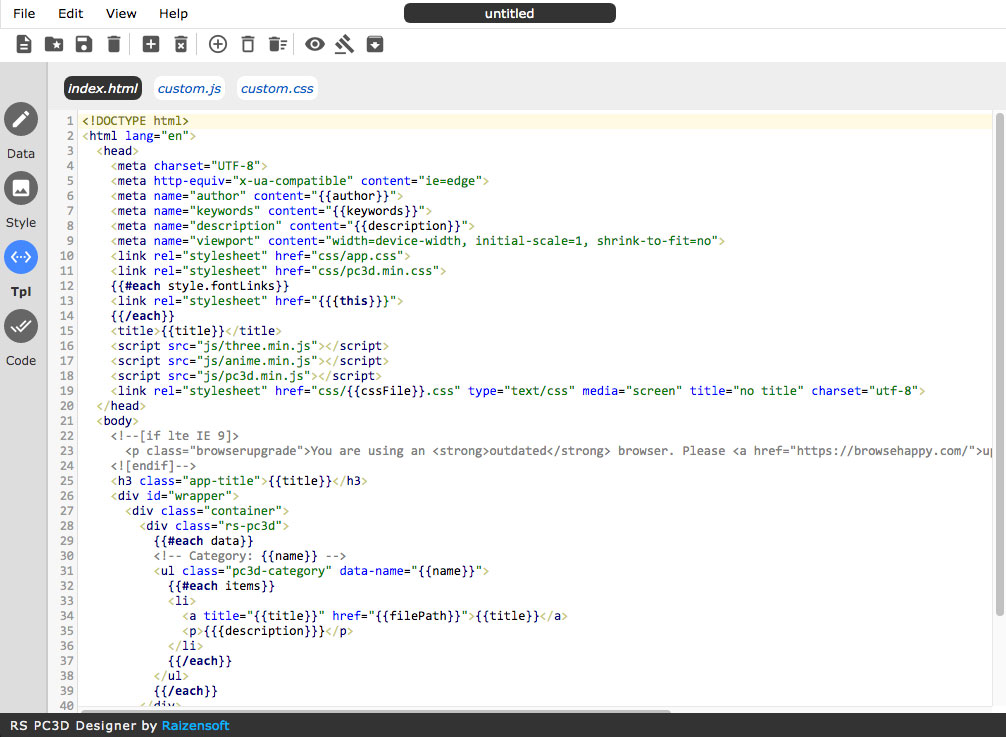 The Template Editor shows default templates for the main html, javascript and css files. The template uses handlebarjs syntax to pull the dynamic data from Data Editor and Project Settings.